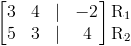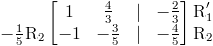 A continuación, cambiamos el coeficiente en la segunda fila que se encuentra debajo del coeficiente principal en la primera fila. Esto se logra multiplicando R 2 por -1 ⁄ 5 y luego sumando el resultado a R 1 .